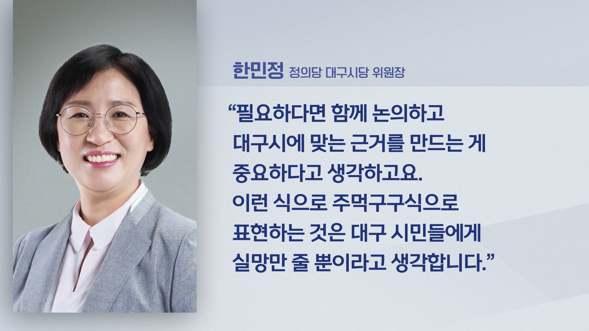 한민정 정의당 대구시당 위원장은 "필요하다면 함께 논의하고 대구시에 맞는 근거를 만드는 게 중요하다고 생각한다. 이런 식으로 주먹구구식으로 표현하는 것은 대구 시민들에게 실망만 줄 뿐이라고 생각한다."고 밝혔습니다.