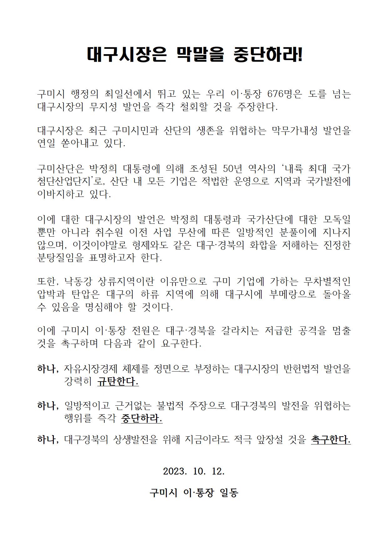 구미 지역 이·통장 676명은 10월 12일 구미시 낙동강체육공원에 모여 김장호 구미시장을 연일 비난하는 홍준표 대구시장에게 막말 중단을 촉구했습니다.