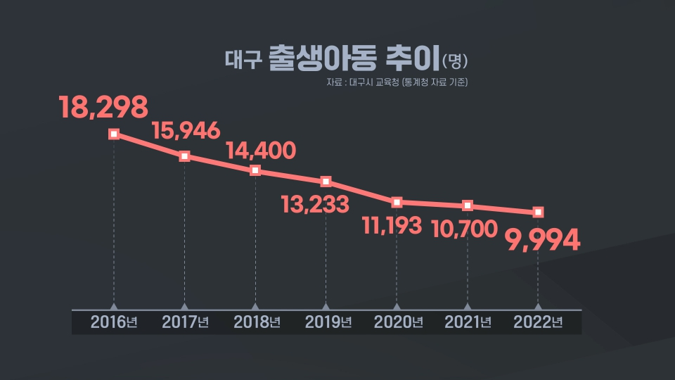 2016년 대구의 신생아 수는 18,298명, 2017년 15,946명, 2018년 14,400명이던 것이 2021년 10,700명까지 줄더니 2022년에는 만 명 아래로 감소한 겁니다.