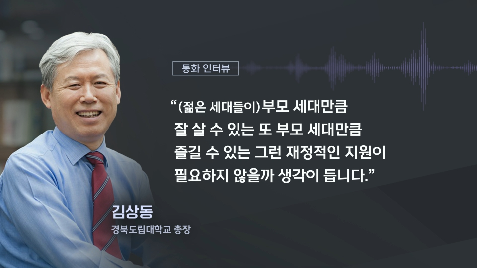 통합을 주도하고 있는 김상동 경북도립대학교 총장은 "우리가 발전을 하는 것이 인구가 적정 수준이 되지 않으면 유지할 수가 없고 아무리 과학 발전을 해서 로봇으로 대처한다 하더라도 한계는 있을 것이고 젊은 세대들이 부모 세대만큼 잘 살 수 있는 또 부모 세대만큼 즐길 수 있는 그런 재정적인 지원이 필요하지 않을까 생각이 듭니다."라며 정책 입안과 추진이 시급하다고 했습니다.