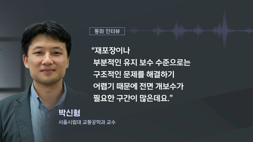 박신형 서울시립대 교통공학과 교수 "단순한 재포장이나 부분 유지 보수로는 구조적으로 더 이상 고속도로 기능을 유지하기 어려운 구간들이 많아 전면적인 개량이 필요합니다. 특히, 교량과 터널 등의 구조물은 부분 차단으로 기능을 개선하기 어려움이 많습니다.