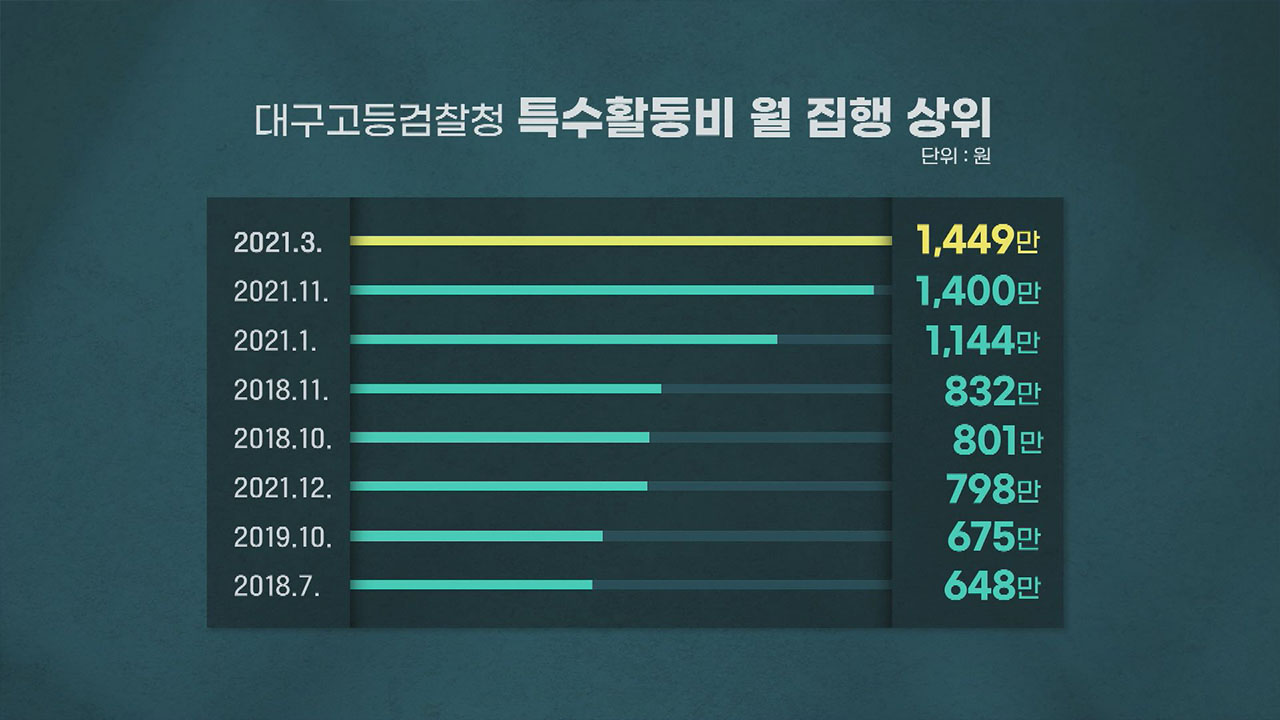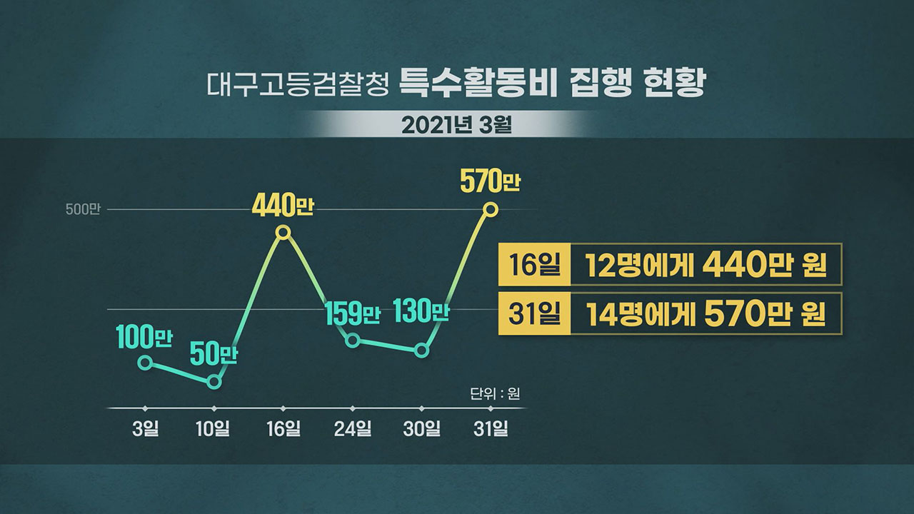 대규모 집행이 이뤄지기도 했습니다. 3월 새 두 차례인데요, 3월 16일엔 12명에게 440만 원, 3월 31일에는 14명에게 570만 원이 분배됐습니다. 100만 원부터 50만 원, 30만 원, 20만 원 등의 현금이 여러 명에게 차등해 지급됐습니다. 16일과 31일 이틀 동안에만 1,010만 원 사용됐는데, 64개월 동안 대구고검이 월평균 특활비로 390만 원을 쓴 걸 고려하면, 하루 만에 월 평균치가 나간 겁니다.