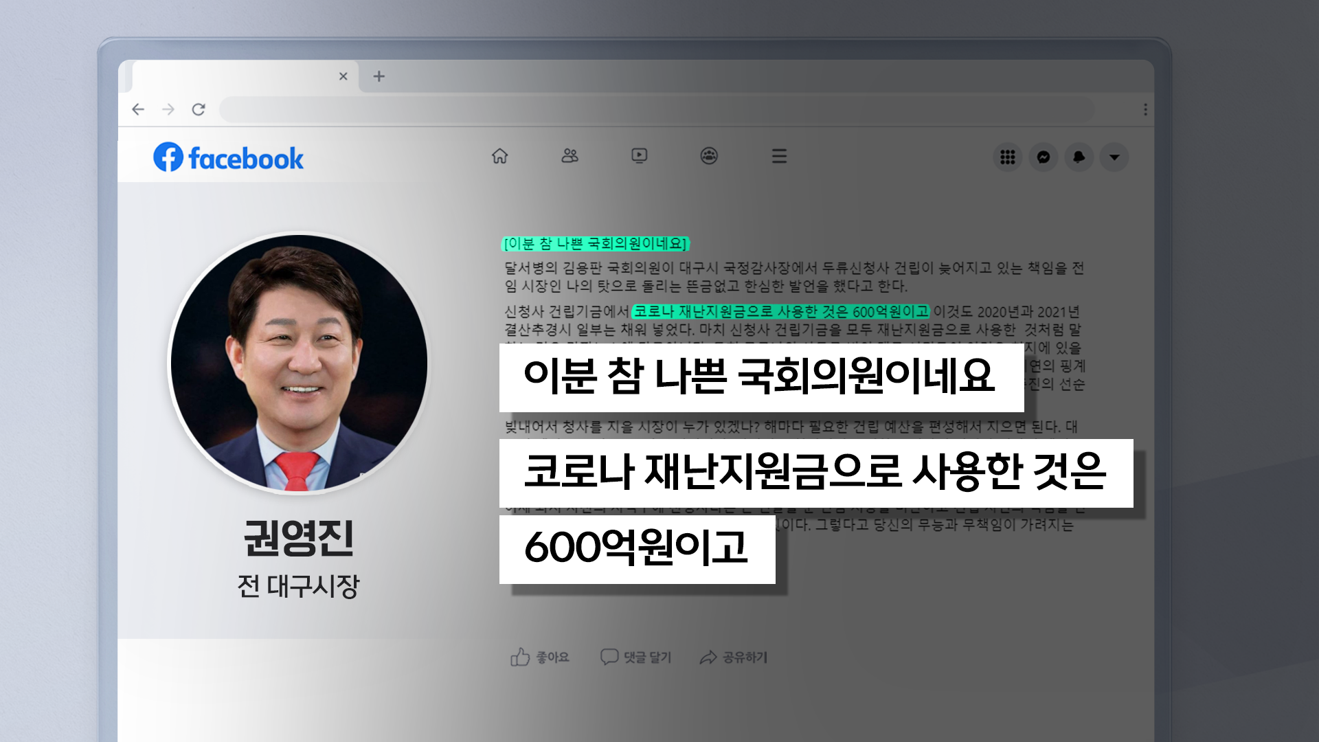 이에 대해 권 전 시장은 10월 23일 자신의 SNS에 '이분 참 나쁜 국회의원이네요'라는 제목의 글을 올렸습니다.