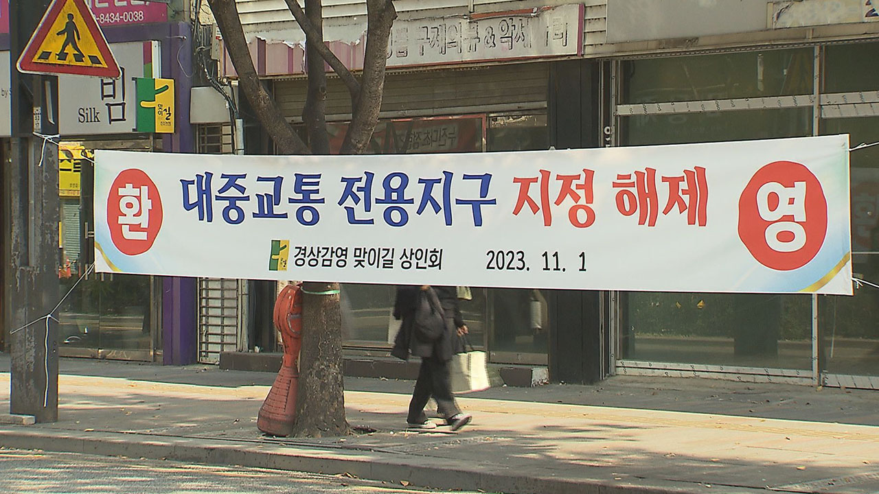 대중교통전용지구 해제를 환영한다는 현수막이 걸렸고, 적지만 도로 양편으로 트럭과 승용차가 달렸습니다.