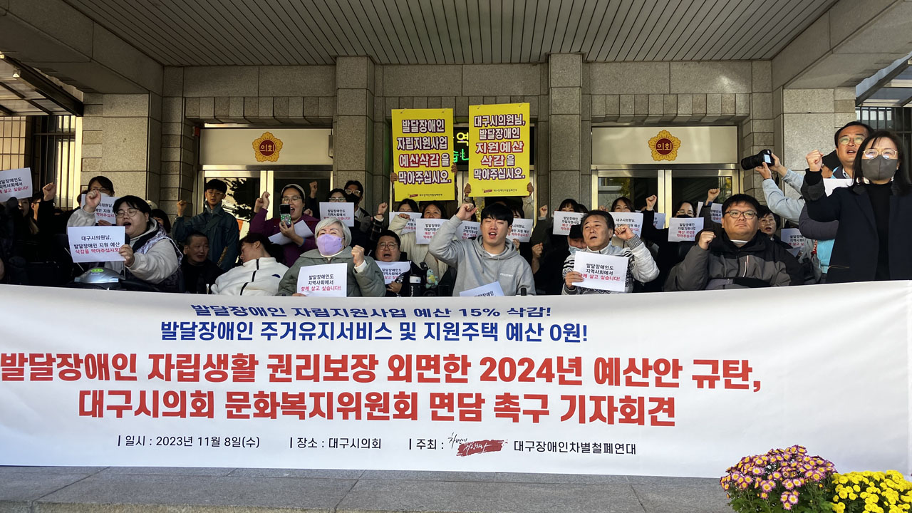 대구장애인차별철폐연대는 11월 8일 대구시의회 앞에서 기자회견을 열고 장애인 지원 사업 관련 예산 삭감 철회를 촉구했습니다.