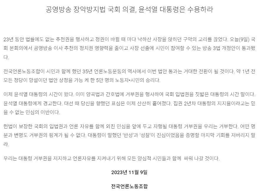 전국언론노동조합이 11월 9일 국회를 통과한 방송 3법에 대해 윤석열 대통령이 거부권을 행사하지 말 것을 촉구했습니다.