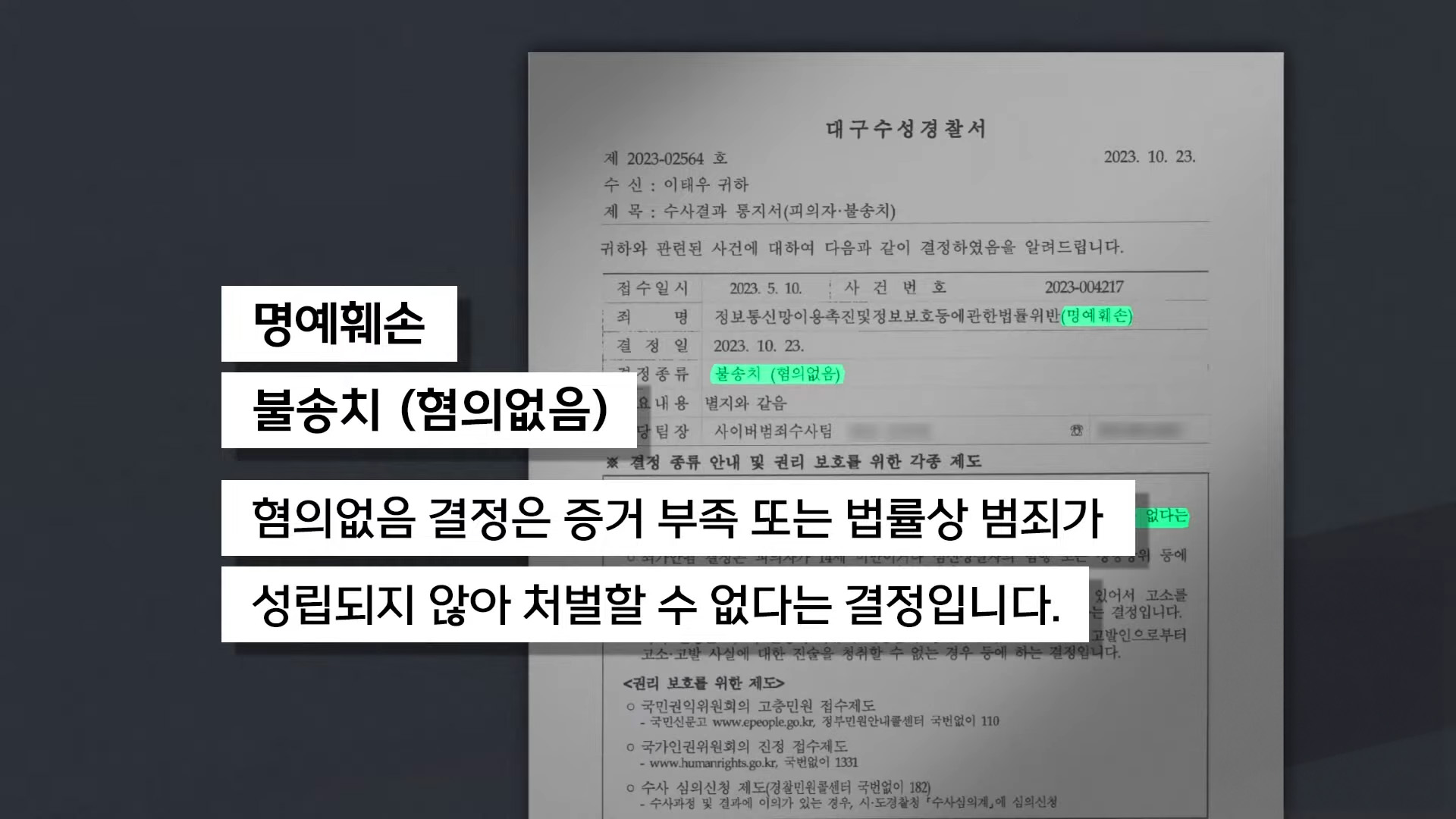 경찰은 무혐의와 각하 등의 이유로 불기소 처분 결론을 내렸습니다.