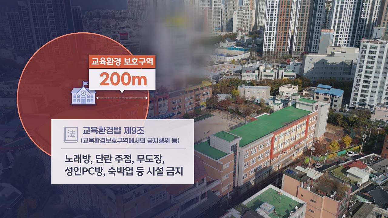 학생들의 위생과 안전, 학습, 교육 등 환경에 나쁜 영향을 줄 수 있는 시설은 원칙적으로 운영할 수 없도록 법이 막고 있습니다.