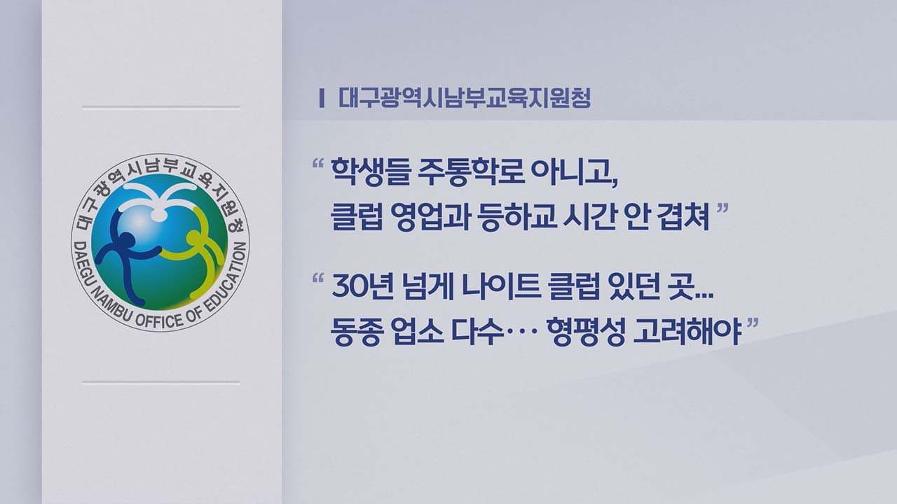 관할인 대구시남부교육지원청은 나이트클럽이 해당 초등학교 학생들의 교육 환경에 미치는 영향이 크지 않다고 판단하고 '운영 가능'으로 심의를 통과시켰습니다.