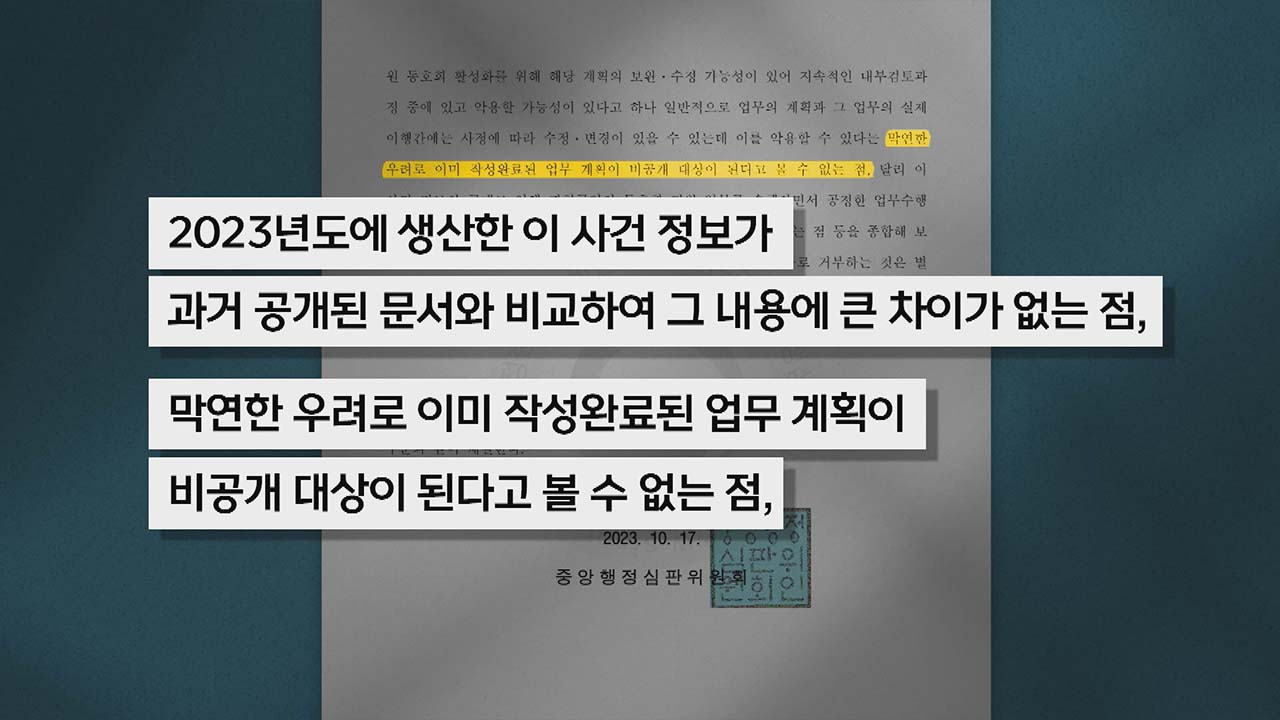 행심위는 "대구시가 2023년 생산한 정보가 과거 공개된 문서와 비교해 내용에 큰 차이가 없다고 짚으면서 내부검토 중에 있고 악용할 가능성이 있다고 주장하나, 막연한 우려로 작성 완료된 업무 계획이 비공개 대상이 된다고 볼 수 없다"며 "정보 공개로 공정한 업무수행에 현저한 지장을 초래할 것이라고 볼 수 있는 정황이 확인되지 않는다"라고 판단했습니다.