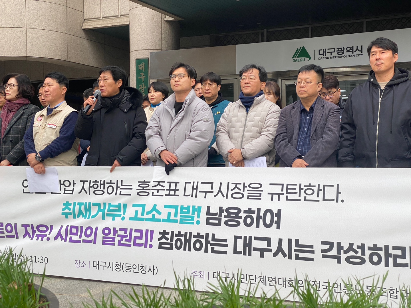 전국언론노조 대구경북협의회와 대구시민단체연대회의가 11월 29일 대구시청 앞에서 기자회견을 열고 "홍준표 대구시장이 언론 탄압을 자행하고 있다"며 규탄했습니다.