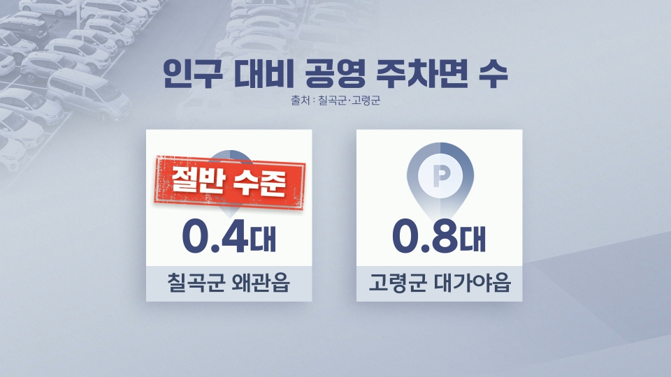 공영주차장 주차면 수가 왜관읍 인구의 1/3도 되지 않은 고령군 대가야읍과 비교하면 인구 대비 절반 수준에 그칩니다.