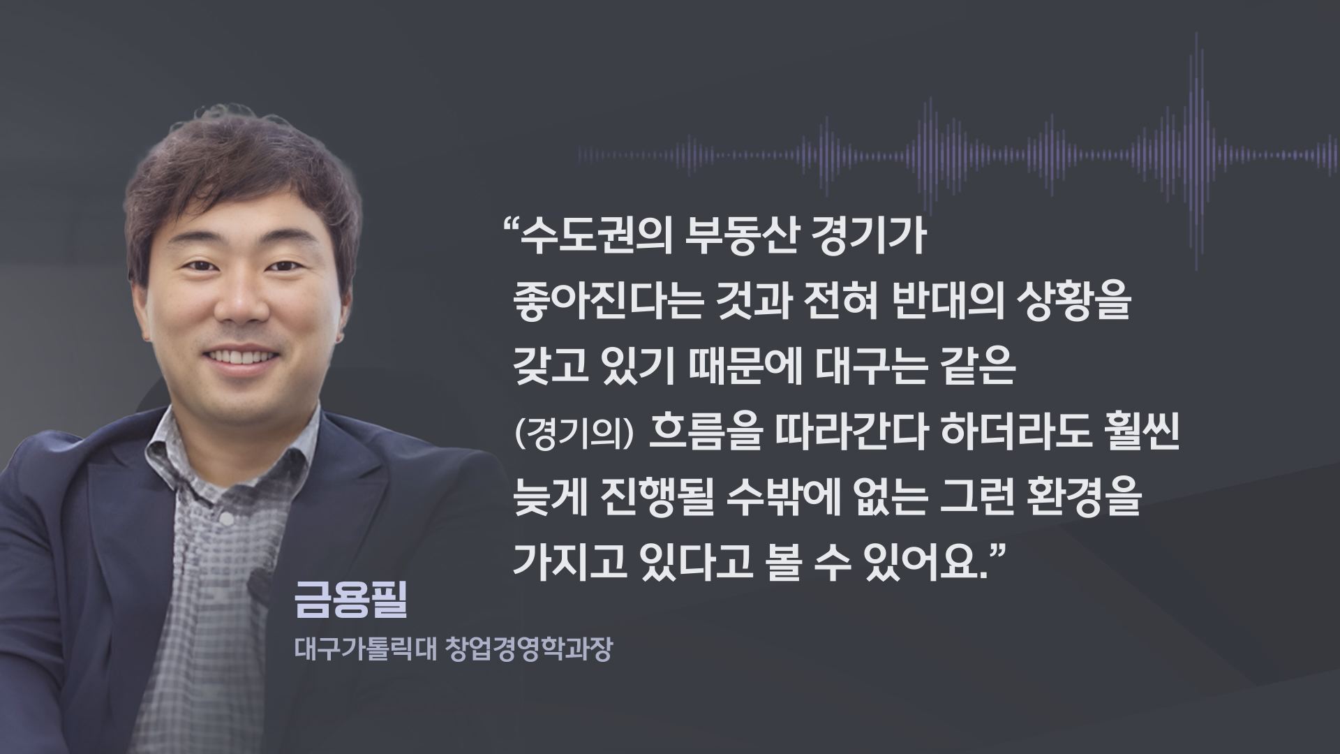 금용필 대구가톨릭대 창업경영학과장은 "대구는 부동산 10만 세대가 분양 중에 있고, 입주 중에 있고, 공사 중에 있어서 이런 세대들이 최고의 악재죠. 수도권의 부동산 경기가 좋아진다는 것과 전혀 반대의 상황을 갖고 있기 때문에 대구는 전국 평균과 같은 경기의 흐름을 따라 다 하더라도 훨씬 늦게 진행될 수밖에 없는 그런 환경을 가지고 있다고 볼 수 있어요."라고 했습니다.