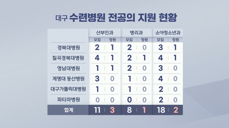 대구의 한 수련병원 관계자는 "과거 5년 동안 6백 개 정도 소아(청소년)과가 문을 닫았거든요. 출산율에 부응하는 개원의들의 수익구조를 어느 정도는 보전해 주는 정부 정책이 나와야 하는데 있어서 지금 형태로는 필수 의료 분야 전공의 미달 사태는 상당 기간 계속 갈 겁니다."라면서 걱정했습니다.