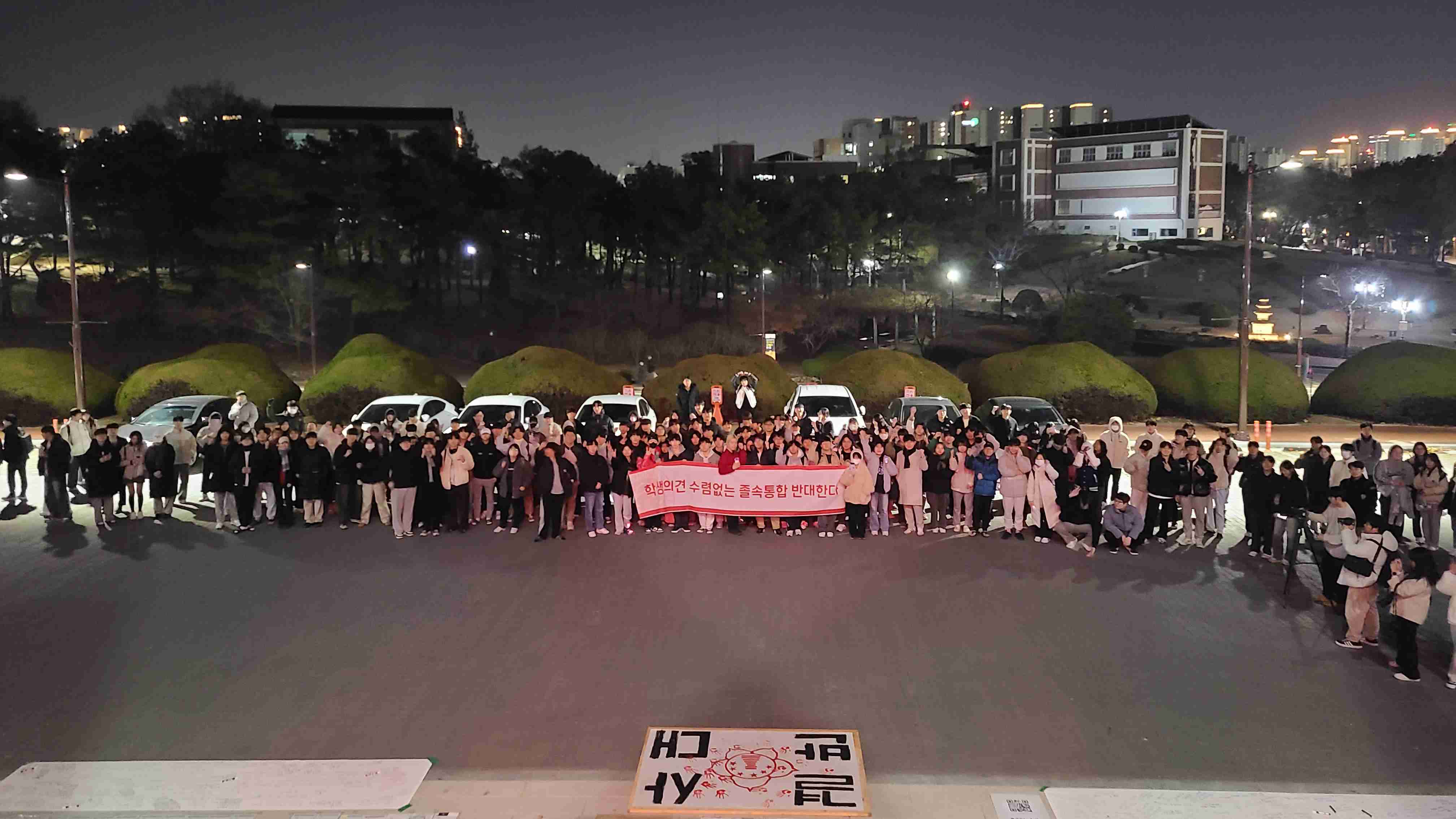 앞서 총장과의 면담이 진행되는 동안 본관 건물 앞에서는 많은 학생들이 '학생 의견 수렴 없는 졸속 통합 반대한다'라는 현수막을 들고 항의 집회를 벌이기도 했습니다.