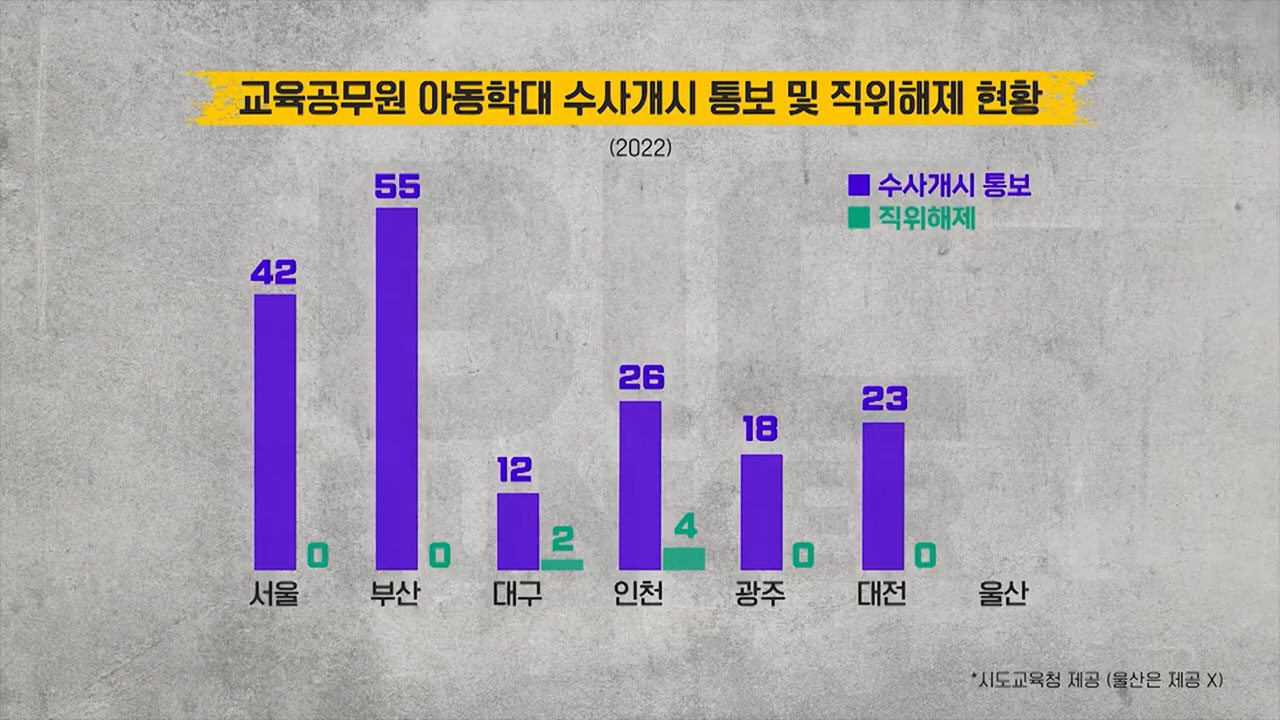 과거 학생이라는 이유로 부당한 행동 규제와 체벌이 당연하게 받아들여졌던 시절이 있었습니다. 그때는 교권 남용이 문제였습니다. 그렇다면 지금은 어떨까요? 현재 아동학대 방지법 중 정서학대 조항에 따르면 의심만으로도 신고할 수 있습니다. 2022년의 경우 교육공무원 아동학대 수사 개시 건수를 보면 대구 12건, 부산 55건, 경기 107건 등 448건입니다(울산 제외). 이 중 직위 해제된 교육공무원은 35명으로 비율은 7.8%입니다.