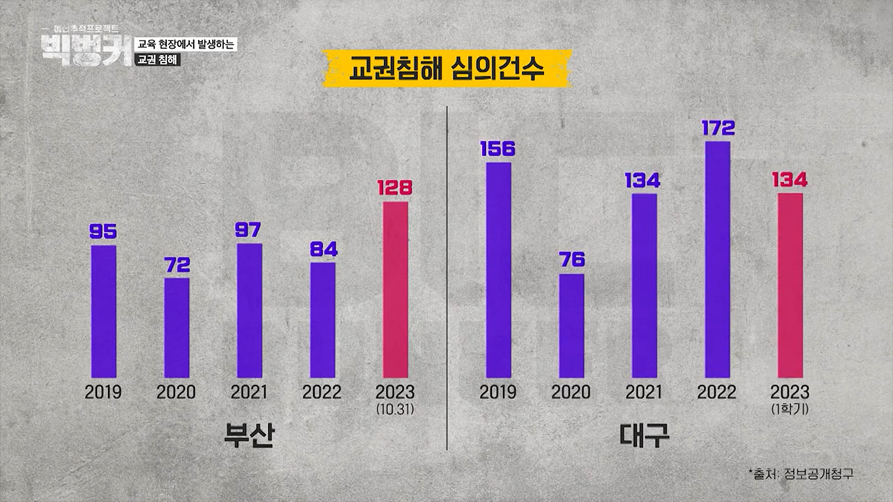 문제는 이런 일들이 뉴스나 기사에서만 나오는 일이 아니라는 점입니다. 정보공개 청구 결과 2023년 1학기까지 대구에서 발생한 교권 침해는 134건으로 나타났습니다. 2021년의 경우 1년 동안의 교권 침해가 134건이었는데, 2023년에는 한 학기에만 134건인 겁니다. 부산의 경우 2023년의 경우 10월 31일까지 128건이 접수됐는데, 부산에서는 2019년부터 2022년까지 100건을 넘긴 경우가 한 해도 없었는데, 2023년에는 10월에 이미 134건을 기록했습니다.