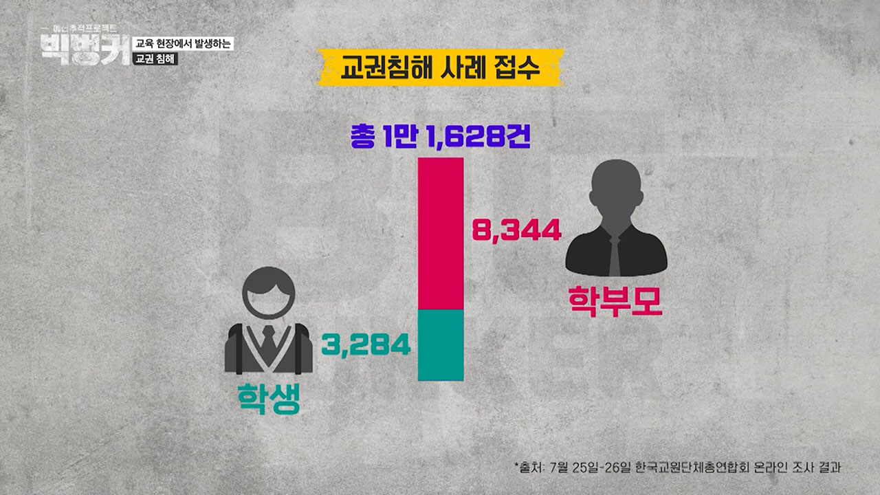 실제로 교총이 2023년 7월 25일~26일, 만 하루 동안 피해 사례를 접수한 결과 총 1만 1,628건 중 학부모의 교권 침해(8,344건)가 학생(3,284건)보다 두 배 이상이 될 정도로 많은 비중을 차지했습니다.