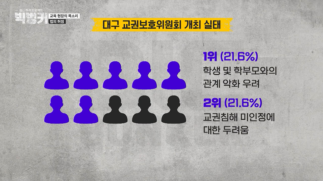 하지만 이런 교권보호위원회가 유명무실하다는 지적이 많습니다. 대구 교사노조 조사에 따르면 대구의 교사 10명 중 7명이 교권 침해를 당했음에도 교권보호위를 열지 않은 것으로 나타났습니다. 이유로는 교권보호위를 개최하게 되면 '학생, 학부모와의 관계 악화 우려'가 1위를 차지했고, 교권 침해 미인정으로 인한 두려움, 절차적 부담 등이 뒤따랐습니다.