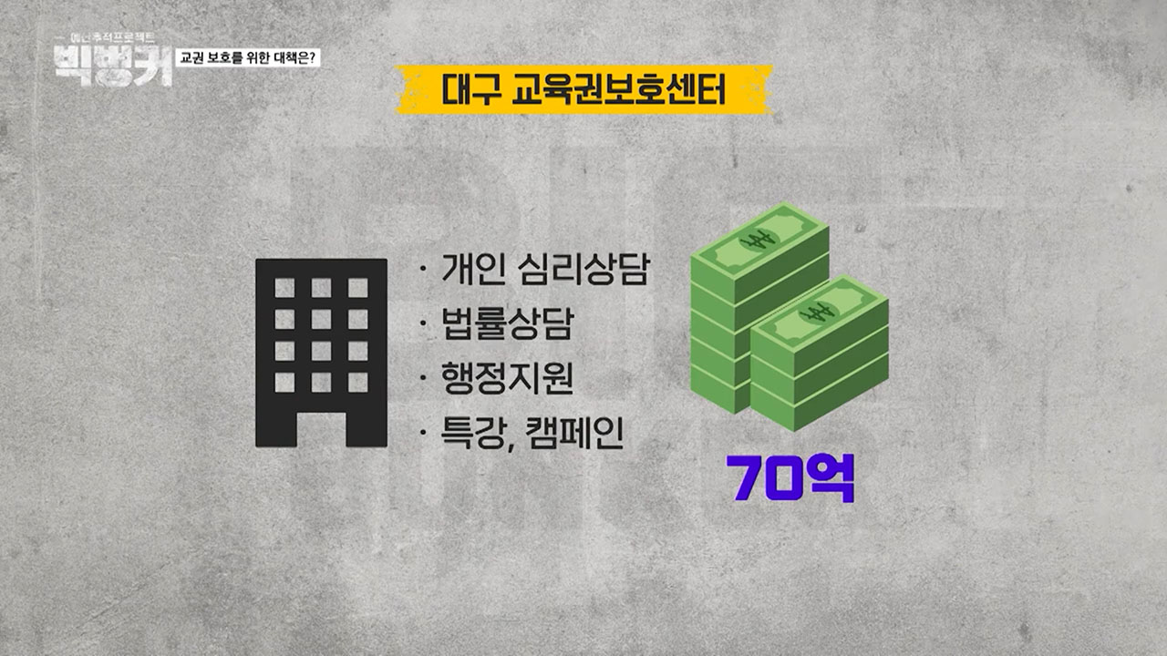 우지영 나라살림연구소 수석연구위원 "일단 대구시교육청과 부산시교육청의 교권 보호, 교원 보호를 위한 예산이 얼마인지부터 짚어보죠. 2019년부터 1023년 10월 31일까지 약 5년간 두 곳의 예산은 130억 3,560만 8천 원입니다. 1년에 26억 정도인 셈으로, 대구시교육청 5년 치 예산이 70억 원, 부산시교육청은 60억 원 정도입니다. 이걸 교사 1인당으로 계산하면 대구의 교사 1인당 5년간 29만 원, 부산은 32만 원을 이용할 수 있는 셈입니다. 그럼 다시 교원 힐링센터와 교육권보호센터로 돌아가 보죠. 부산시교육청의 5년 치 예산 60억 원은 모두 교원 힐링센터 예산이라고 하고요, 대구에서는 전체 70억 원 중 센터 운영에 23억 원, 그 외 교권 보호 사업에 약 47억 원을 쓰고 있다고 합니다. 교육권보호센터가 전국에서 최초로 조성된 곳이 대구시교육청이라고 하는데요, 처음에는 에듀힐링센터라고 교원을 위한 치유를 담당하다가 교육권보호센터로 이름을 바꾸면서 교육권을 둘러싼 갈등 조정도 담당하고 있다고 합니다"
