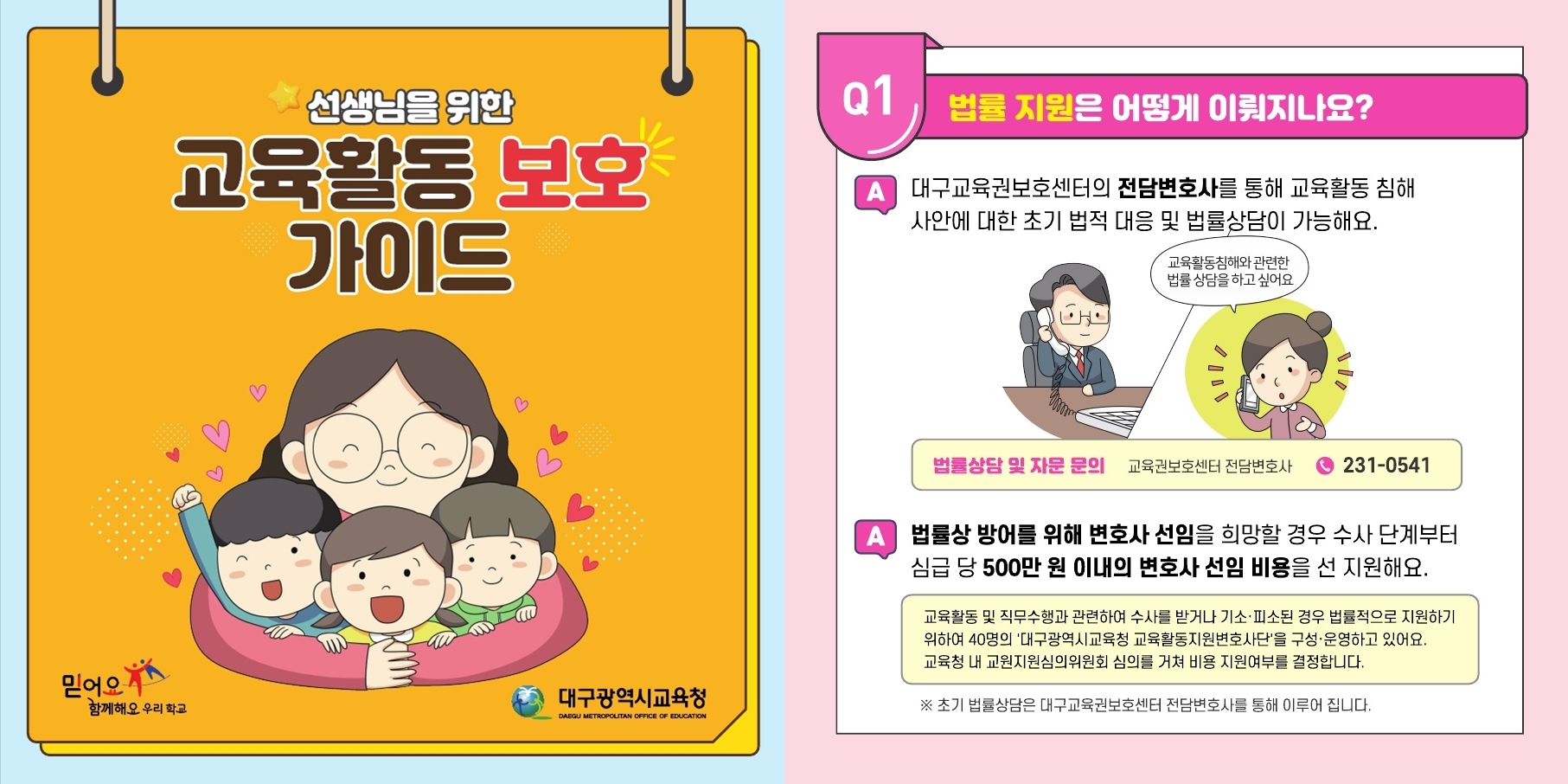 대구시교육청은 교육부 교육활동 보호 종합대책과 교권 보호 4법 통과에 따른 대구시교육청의 주요 교육활동 보호 내용을 담은 가이드북을 교원들에게 배포했습니다.