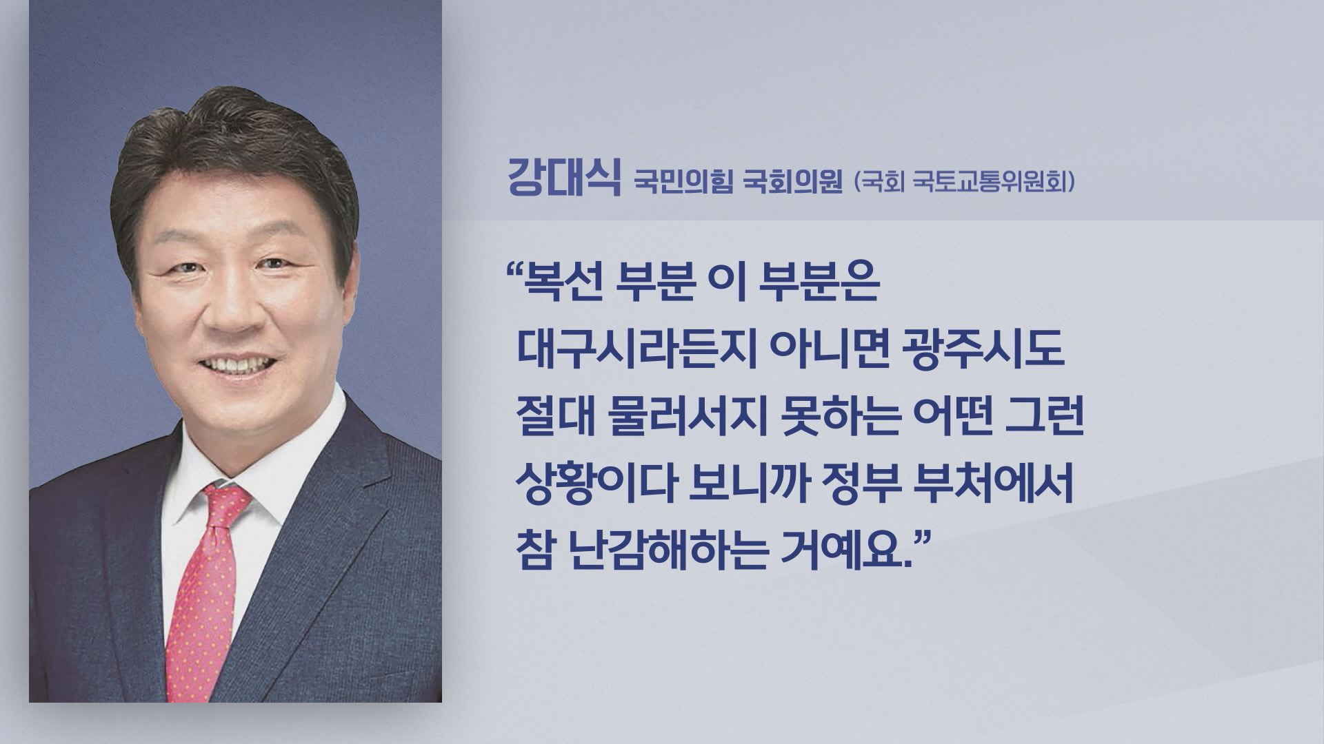 국회 국토교통위원회 소속 국민의힘 강대식 국회의원은 "복선 부분 이 부분은 대구시라든지 아니면 광주시도 절대 물러서지 못하는 어떤 그런 상황이다 보니까 정부 부처에서 참 난감해하고 있다"고 설명했습니다.