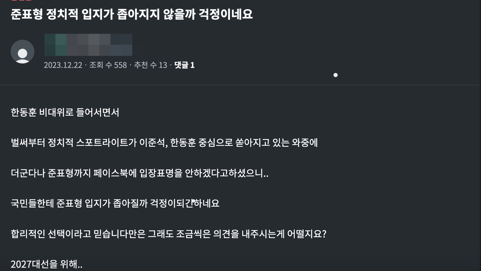 질문자는 "한동훈 비대위로 들어서면서 벌써부터 정치적 스포트라이트가 이준석, 한동훈 중심으로 쏟아지고 있는 와중에 더군다나 준표 형까지 페이스북에 입장 표명을 안 하겠다고 하셨으니 국민들한테 준표 형 입지가 좁아질까 걱정이 되긴 하네요"라고 썼습니다.