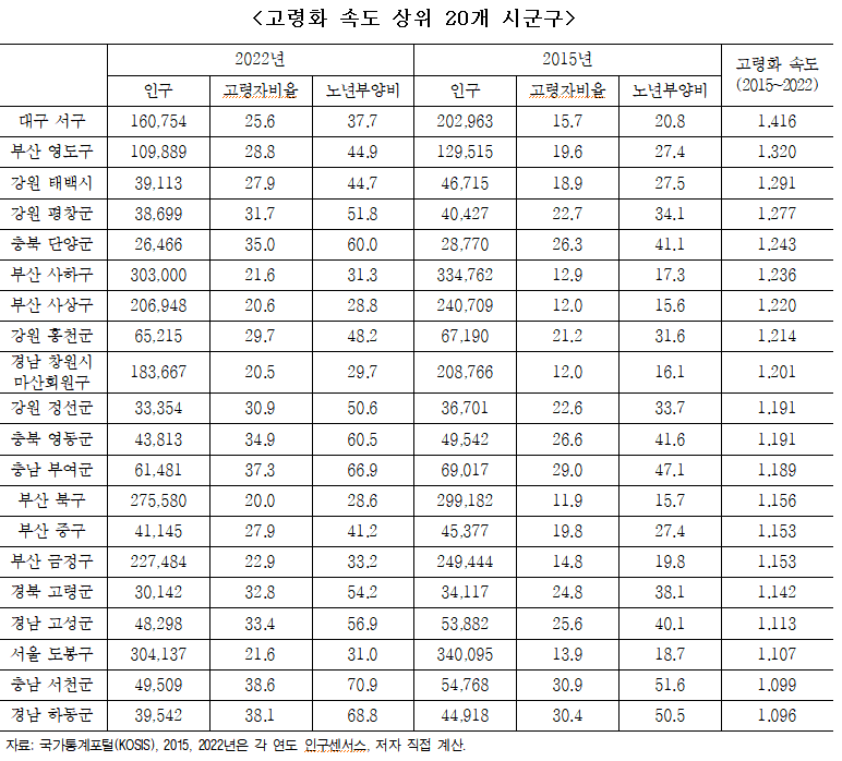 한국고용정보원이 2015년부터 2022년까지 7년 동안의 지역별 고령화 속도를 계산했습니다.