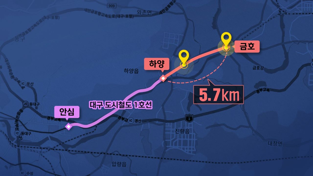 예비타당성조사 결과를 심의해 통과한 대구 도시철도 1호선 영천 연장 사업 총사업비는 2,341억 원이 투입되고, 경산 하양역에서 영천 금호읍까지 5.7km 구간에 단선 지상철로 정거장 2곳이 건설됩니다.