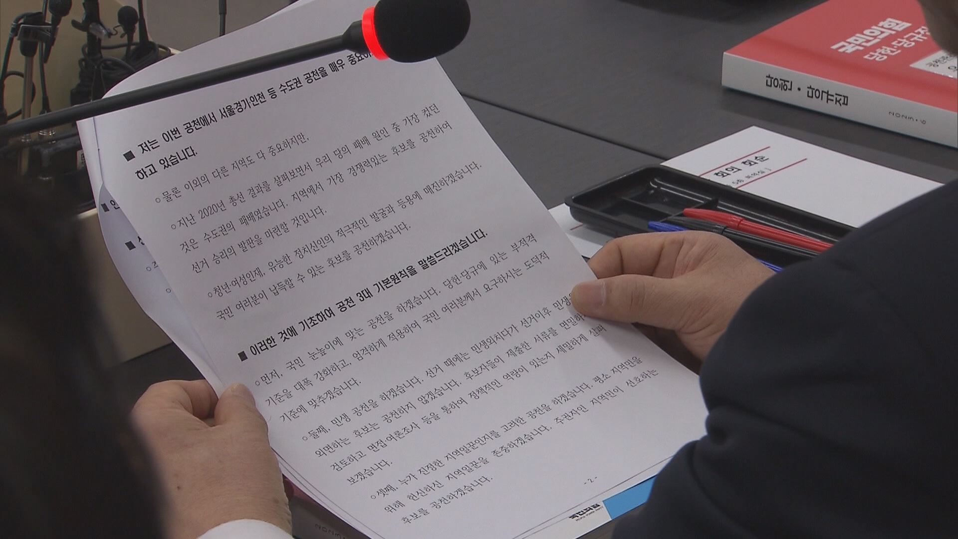 정영환 공천관리위원장은 "정당 역사상 처음으로 시스템 공천 제도를 도입했다"라면서 "질서 있는 세대교체가 가능할 수 있도록 결정했다"고 설명했습니다.