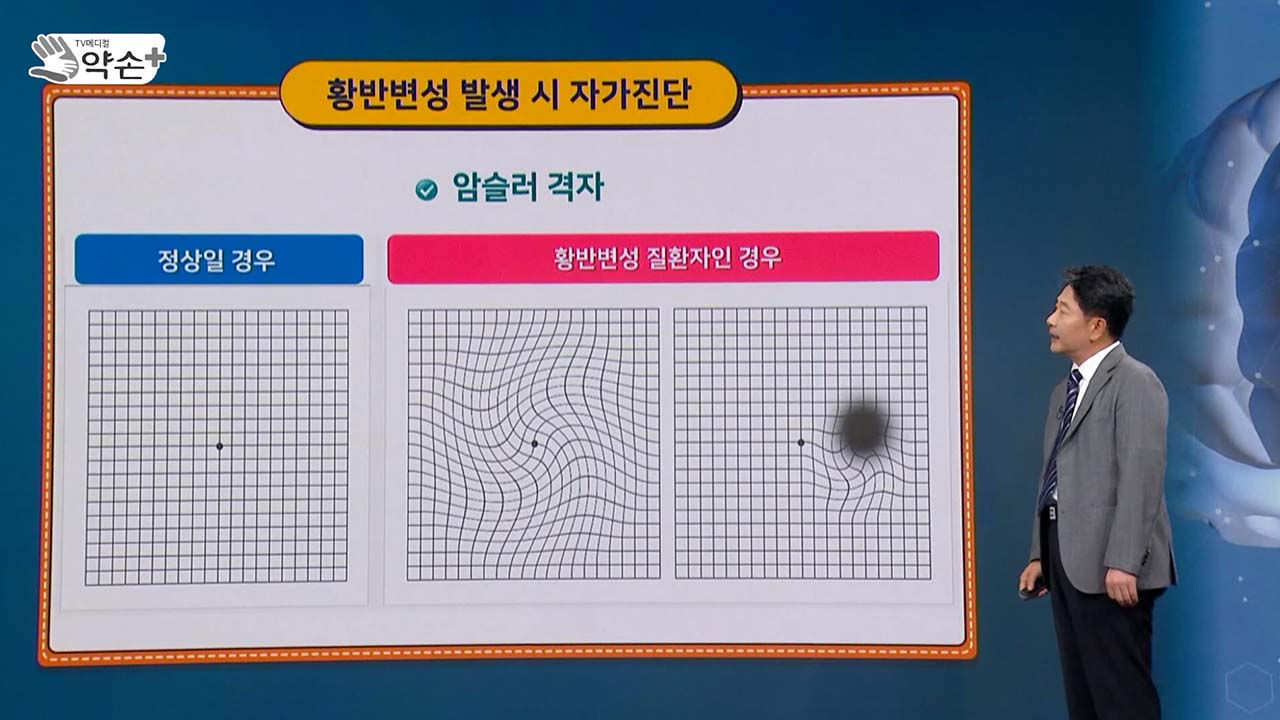눈이 이 중앙을 보게 합니다. 정상적인 사람들은 중앙을 보더라도 실제적으로 이 격자 형태의 직선들이 가로 세로로 똑바르게 가는 모습을 다 느끼게 되는데, 황반의 질환이 있으신 분들은 이러한 직선 형태들이 왜곡되게, 이렇게 물결치게 굽어져 보이는 증상들. 앞서 제가 변형시라고 이야기했죠? 이런 형태들로 이야기하는 경우도 있고. 한쪽이 가리는 형태, 암점과 같은 형태를 나타내는 경우도 있습니다. 그래서 이런 암슬러 테스트를 통해서 ‘아, 눈에 좀 이상이 있구나’ 하는 것을 쉽게 우리가 진단을 내릴 수가 있기 때문에 반드시 황반변성을 가지신 분들, 특히 건성 형태의 황반변성을 가지신 분들은 이러한 테스트를 정기적으로 해보시는 게 중요하다고 할 수 있겠습니다.