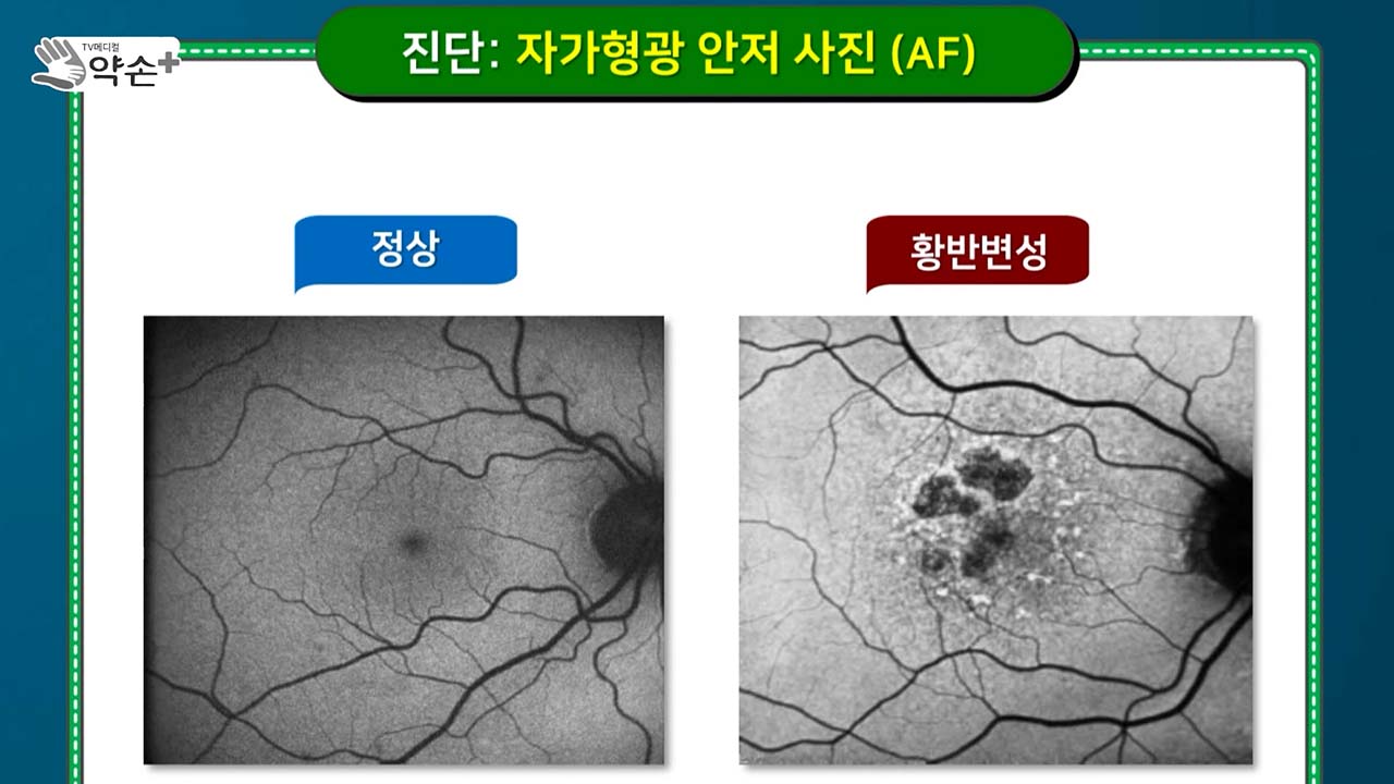 자가 형광 안저 사진인데요. 이런 사진을 찍게 되면 건성 형태의 황반변성이 있는 경우에 '황반의 위축이 어느 정도 범위 내에서 있느냐'를 쉽게 알 수 있는 진단 검사 방법이고요.