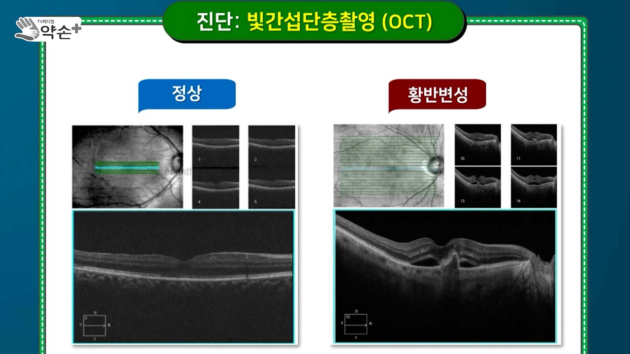 이 검사가 우리 안과의 영역에서 가장 중요한 검사 방법으로 생각을 하시면 되겠습니다. 우리가 쉽게 환자들한테 눈 CT라고 이야기하는데 망막의 단면을 볼 수 있는 검사 방법이 되겠습니다. 그래서 정상적인 모습들은 여기에 OCT 사진에서 보시다시피 이런 모습을 보여야 하는데, 여러 가지 질환들이 있는 경우에 이렇게 툭 튀어나온 부분들도 있고, 까맣게 보이는 이 부분들이 제가 물이라고 이야기했죠. 산출물 같은 모습들이 명백하게 보이기 때문에 쉽게 진단을 내릴 수 있는 아주 좋은 진단 기구라고 보시면 되겠습니다.