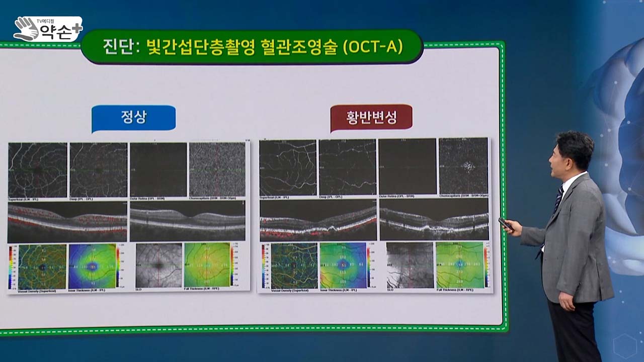 그다음에는 이런 OCT에다가 혈관 안저 촬영 대신에 우리가 혈관 조영술을 사용하지 않고 안저 혈관 조형을 할 수 있는 방법이 또 개발됐는데, 이것을 OCT-A라고 이야기하게 되고요. 우리가 조영술 없이도 망막 내에, 망막 밑에 나쁜 혈관이 있는 모습들을 보여줄 수 있는 좋은 진단 기구라고 보시면 되겠습니다.