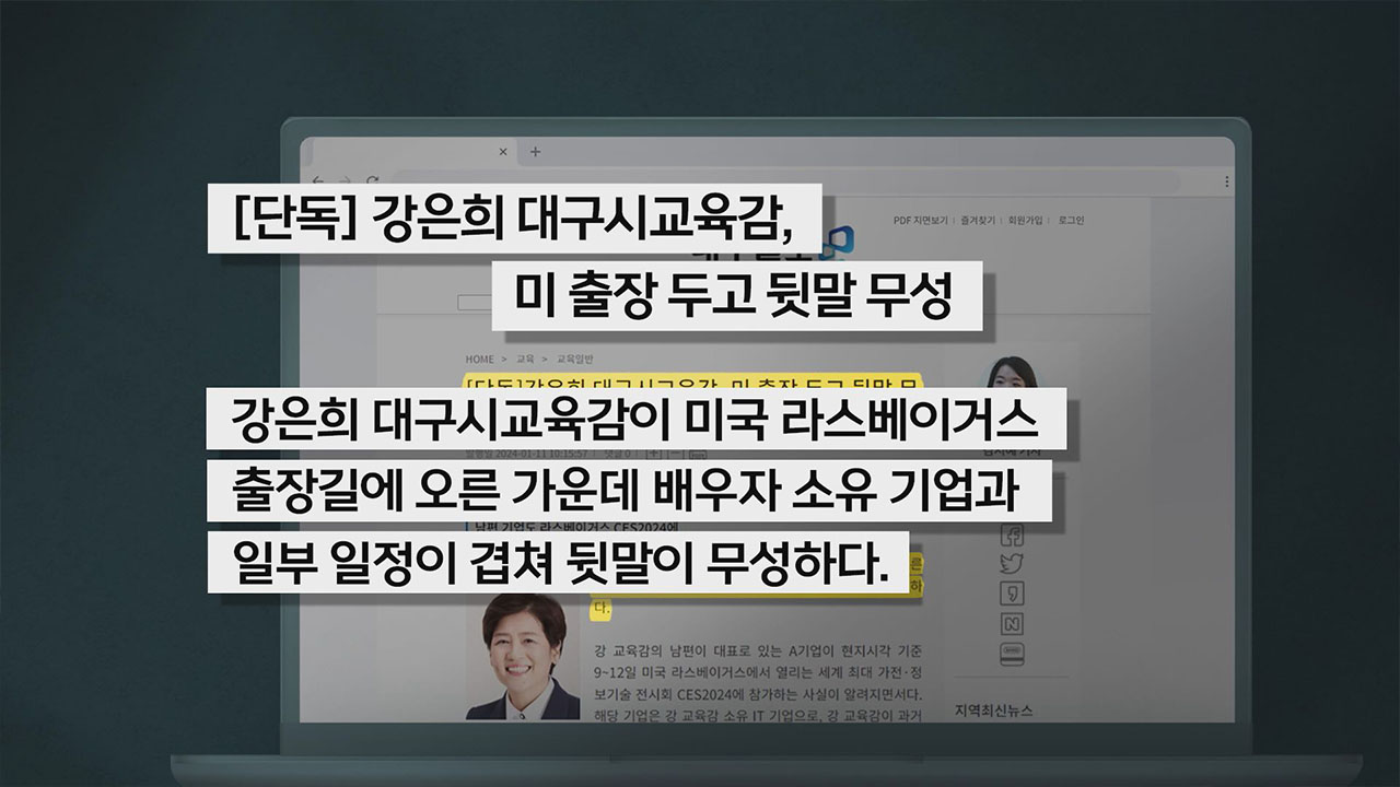 강 교육감의 남편이 대표로 있는 A 기업이 현지 시각 기준 1월 9일~12일 미국 라스베이거스에서 열리는 세계 최대 가전·정보기술 전시회 CES2024에 참가했는데, 공교롭게도 강은희 대구시교육감이 미국 라스베이거스 출장길에 오른 겁니다. 게다가 해당 기업은 강 교육감 소유 IT 기업으로, 강 교육감이 과거 대표를 지내기도 했습니다. 대구시교육청은 해당 보도 이후 대구일보 출입 기자에게 이메일을 통한 보도자료 배포를 중단한 겁니다.