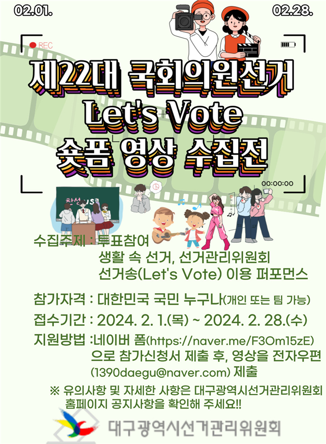 대구시 선거관리위원회는 오는 4월 총선에 유권자 관심을 끌기 위해 '22대 국회의원 선거 숏폼 영상 수집 전'을 개최합니다.