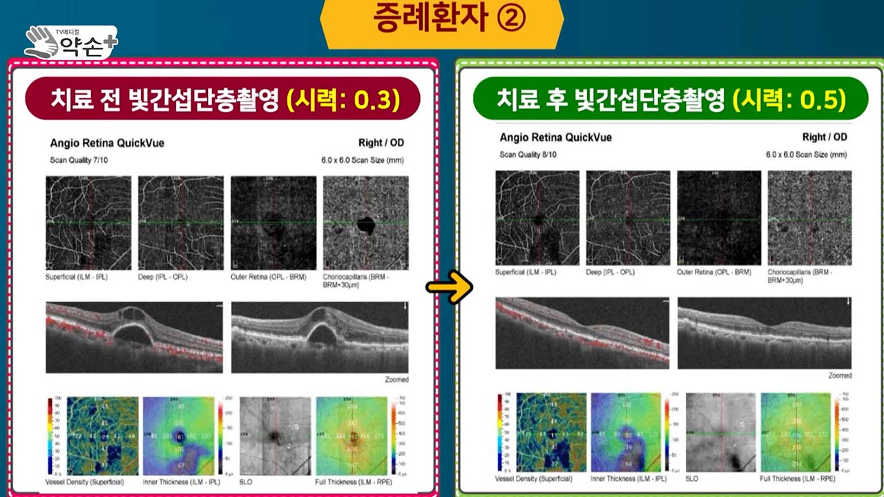 83세 남자 환자인데요. 일주일 전부터 좌측 눈에 시력 저하를 주소로 해서 병원에 내원하신 분입니다. 시력이 0.1로 떨어져 있고요. 이 사진을 보시면 아시겠지만 새카맣게 보이는 부분도 있고 희게 보이는 부분도 있고 형태가 좀 다르죠? 그래서 이런 형태로 왔습니다만, 저희가 제일 중요한 검사가 아까 OCT라고 이야기를 드렸습니다. 그래서 이 환자의 OCT 검사를 해보면 이렇게 망막 밑에 피와 그다음에 물과 그다음에 여러 가지 어떤 조직의 변화들이 보이는 그림을 보여주는데요. 이 사진상에서도 신생혈관이 보이는 그림들인데요. 습성 형태의 황반변성으로 진단을 내리고 주사 치료를 시작을 했습니다. 몇 번의 치료 후, 주사 치료 후에 보시면 거의 많은 부분이 소실이 되고 좋아지는 모습을 직관적으로 보실 수 있죠.