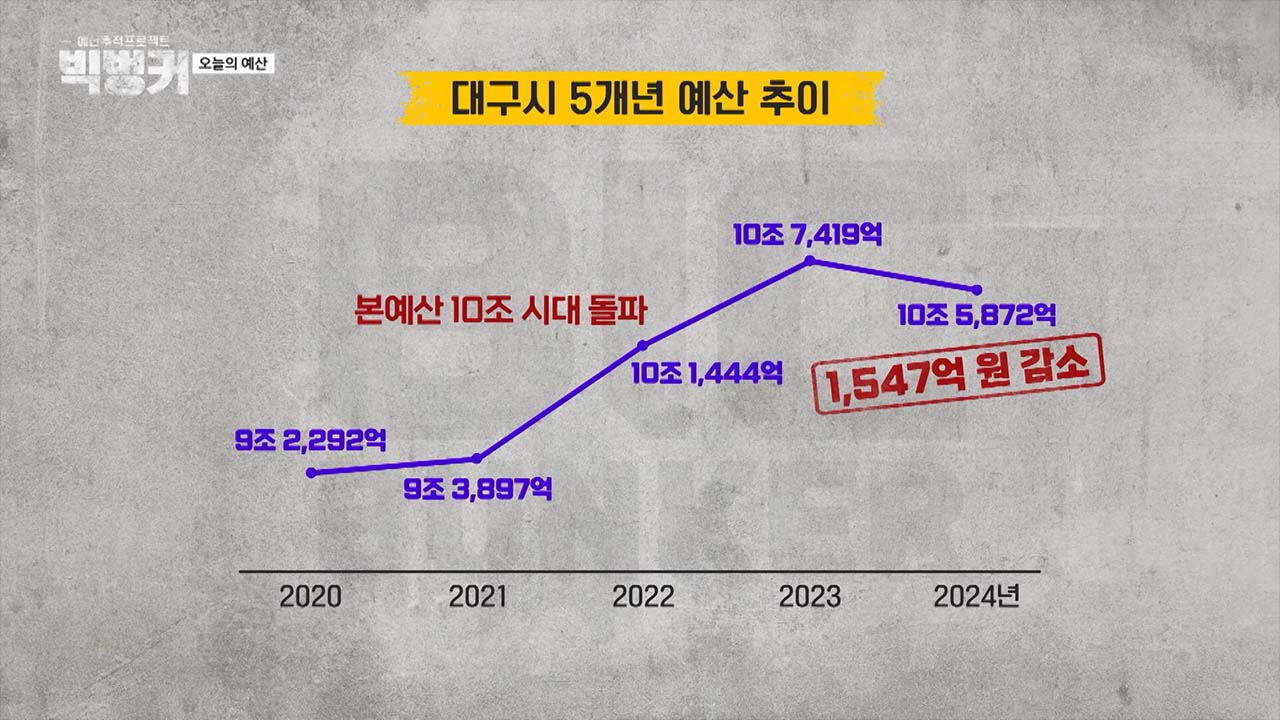 대구시 예산 추이를 보면 2023년까지는 상승해 왔습니다. 2020년 9조 2,292억 원에서 2021년 9조 3,897억 원, 2022년에는 10조 1,444억 원으로 본예산 10조 시대를 처음으로 돌파했습니다. 예산의 경우 세입 부분도 자세히 살펴봐야 하지만 수치상으로만 보면 2024년은 1년 전 10조 7,419억 원보다 약 1,547억 원 감소한 규모로 편성됐습니다.