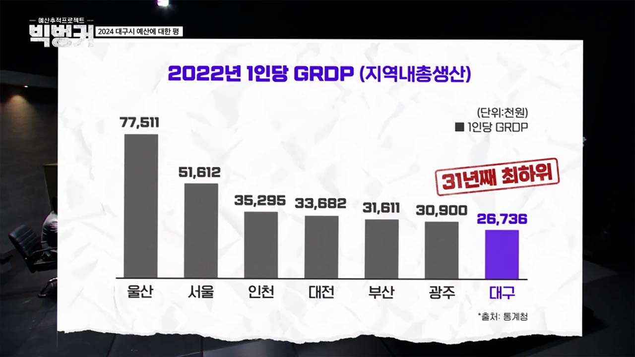 긴축재정은 대구만의 기조는 아닙니다. 정부에서부터 긴축재정 기조를 내세우고 있는데요, 이런 정부 기조에 따라 지자체가 움직일 수밖에 없습니다. 하지만 6개 광역시의 상황을 살펴보면 지자체별로 예산 증가 폭은 다르지만 대부분 2023년보다 예산이 증가했습니다. 서울과 6대 광역시 중에 대구와 광주 두 곳만 2023년 예산 대비 2024년 예산이 감액된 상황입니다. 전국 모두가 힘든 상황인데 올린 이유는 무엇일까요? 어려운 국제 정세와 경제 위기 속에서 서민 경제를 위해 예산을 증가했다는 것이 예산을 늘린 지자체들이 밝힌 이유입니다.