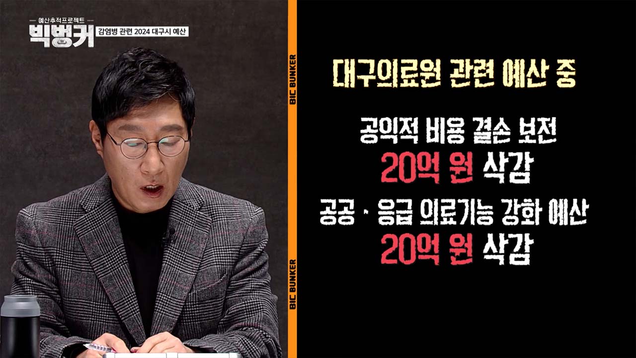 대구는 코로나 직격탄을 맞은 도시이지만 감염병과 관련한 예산은 이번에 많이 삭감됐습니다. 감염병 위기를 겪으면서 대구의료원만으로는 부족하다는 것을 절실히 알았고 제2 대구의료원 건립까지 추진되기도 했습니다. 그런데 대구의료원 예산이 이번에 줄었습니다. 대구의료원 운영 지원 예산과 대구의료원 공공응급의료 기능 강화 예산 등이 각 20억 원 정도 줄어든 겁니다.