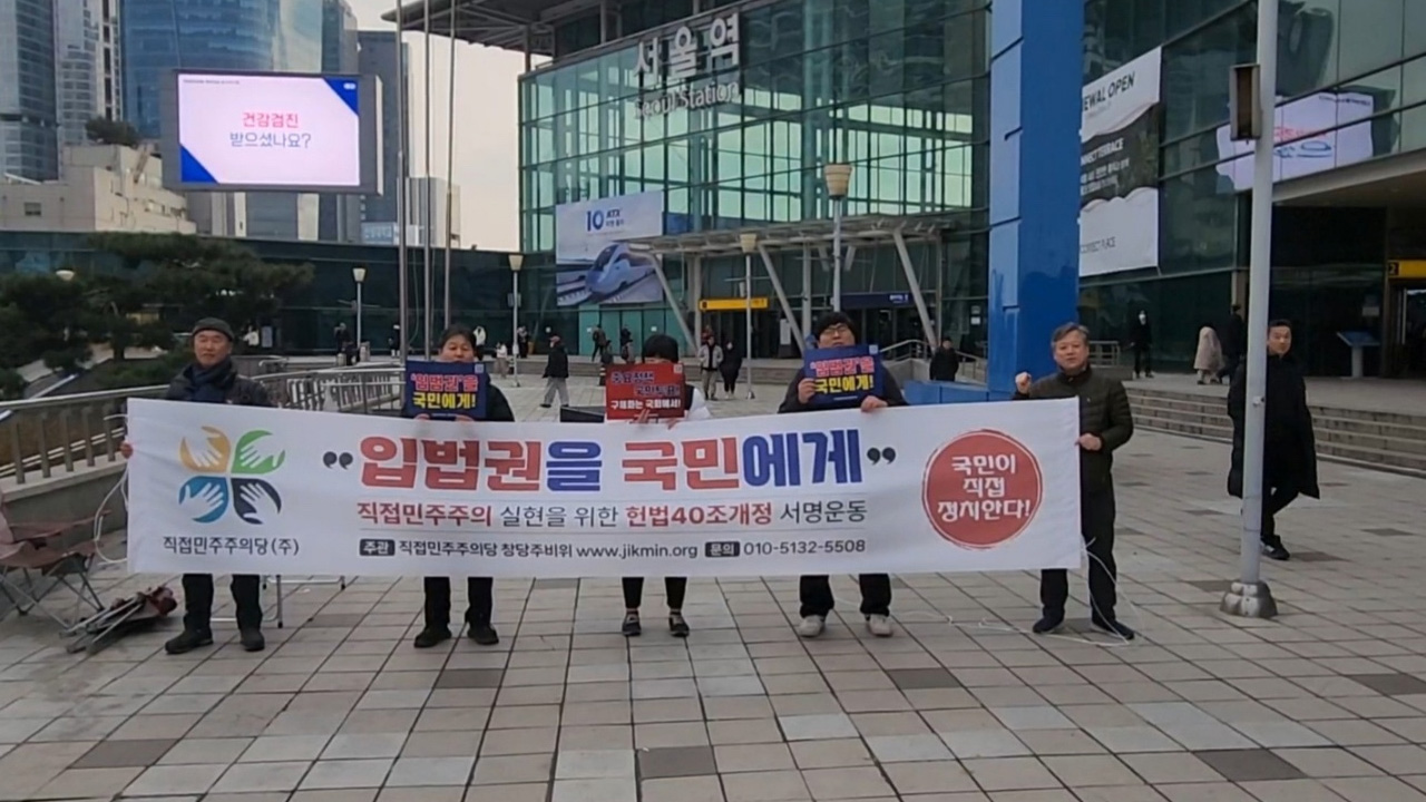 직접민주주의당 주비위원회는 1월 27일 서울역광장에서 '입법권을 국민에게'라는 슬로건을 내걸고 '헌법 제40조 개정 서명 운동'을 시작했습니다.
