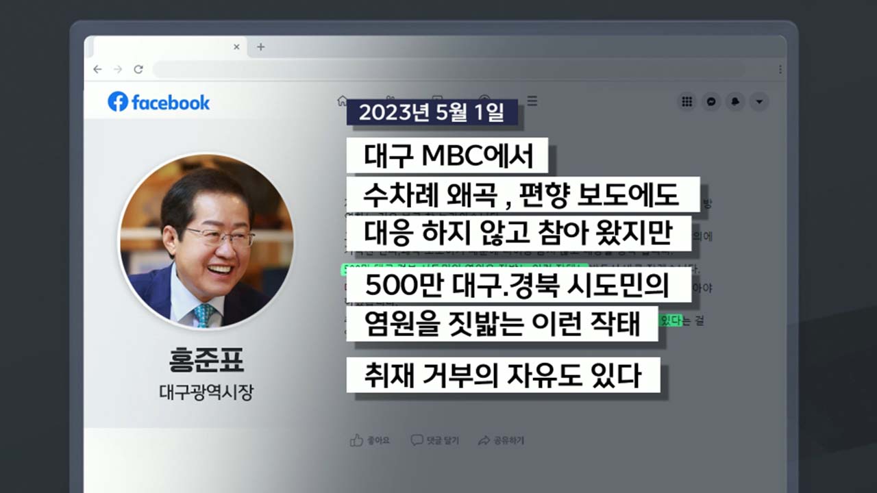 홍 시장은 대구MBC가 여러 차례 왜곡, 편향 보도에도 참아왔지만 500만 대구·경북 시도민의 염원을 짓밟는 작태를 바로 잡겠다며 취재 거부 뜻을 밝혔습니다.