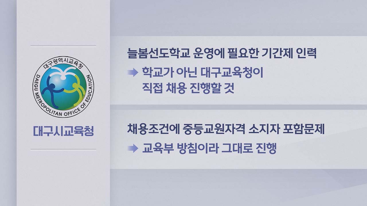 늘봄 선도학교 운영에 필요한 기간제 인력 채용 문제는 현재 문제가 제기되고 있는 일선 학교가 아닌 대구교육청에서 직접 채용을 진행하겠다는 입장을 밝혔습니다.