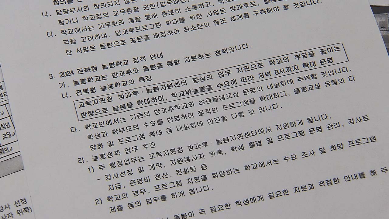 하지만 교육 현장에서는 이런 방침이 지켜지지 않고 기존 교사들이 늘봄학교와 관련된 업무 분담을 받는 경우가 속출하고 있습니다.