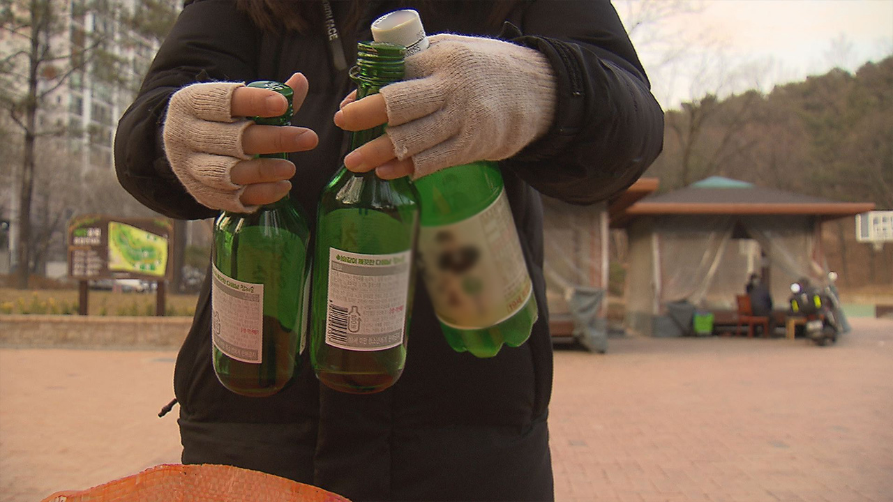 공원 쓰레기통에는 소주병과 막걸릿병들이 버려져 있습니다.
