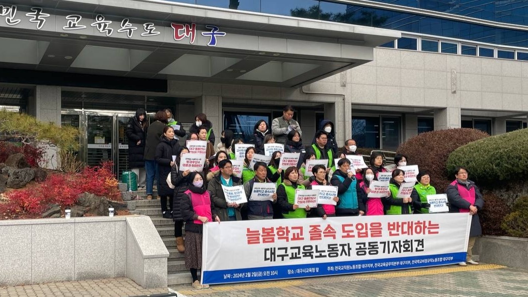 전교조 대구지부, 교육공무직본부 대구지부, 전국학비노조 대구지부는 2월 2일 대구교육청 앞에서 늘봄학교 졸속 시행을 반대하는 기자회견을 열었습니다.