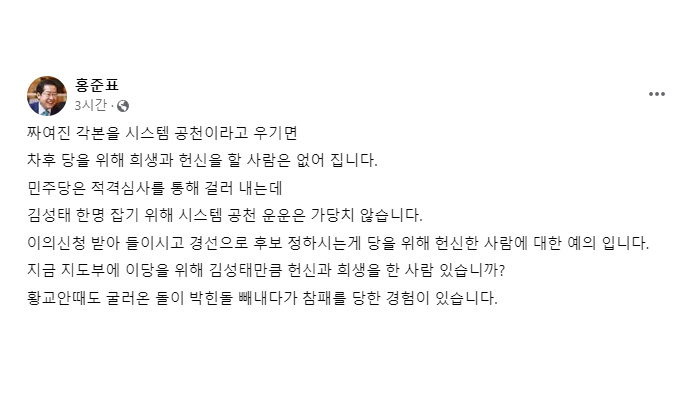 홍 시장은 2월 13일 자신의 SNS를 통해 "짜인 각본을 시스템 공천이라고 우기면 차후 당을 위해 희생과 헌신을 할 사람은 없어진다"라고 지적했습니다.