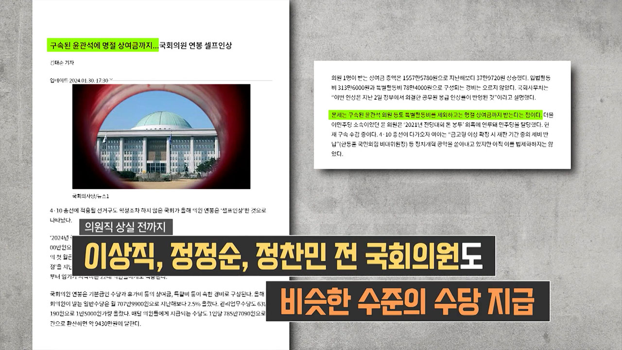 이렇게 세세한 부분까지 세금으로 지원하는 데에는 국민을 대표해서 큰일 하는 데 불편한 거 없게 해주겠다, 그만큼 일 잘해달라는 의미가 담겨 있을 겁니다. 문제는 받는 만큼 일 잘하는 의원도 있겠지만 일을 제대로 안 해도 이런 억대 연봉을 챙길 수 있다는 점입니다. 2023년 12월 한 언론사의 보도에 따르면 윤관석 의원은 2023년 8월에 구속돼 회의에 출석도 하지 않았지만 매달 의원 수당을 챙긴 것으로 알려졌습니다. 21대 국회에서 구속된 이상직, 정정순, 정찬민 전 의원 역시 의원직 상실 전까지 비슷한 수준의 수당을 받았다고 전해집니다. 국회의원 수당은 '국회 보좌 직원 및 의원 수당법'에 따라 지급하는데, 이 법률에 '구속됐을 경우'에 대한 별도의 규정이 없는 것을 악용한 겁니다.