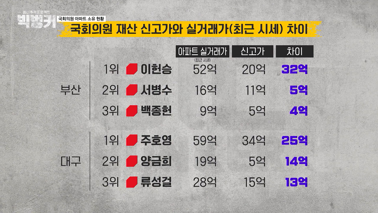 그래서 대구와 부산 국회의원 부동산 재산을 전체적인 공시가격과 실거래가격이 얼마나 차이가 났는지 조사해 봤습니다. 대구 국회의원이 신고한 부동산 재산은 실거래가의 약 75%가 반영돼 있었고, 부산 국회의원은 약 67% 정도가 반영돼 있었습니다. 가장 차이가 많이 났던 건 부산 이헌승 의원이 소유한 반포동 래미안이었는데, 신고 가격 20억 7천여만 원, 실거래가 52억 7천여만 원으로 무려 32억 원 이상 차이가 났습니다. 부산의 김미애 의원을 제외하고는 모든 국회의원의 부동산 신고가가 실거래가에 비교해 낮았는데요, 평균적으로 약 4억 3,500만 원 정도 차이가 났습니다. 그리고 대구의 경우 주호영 의원의 서초 반포아파트가 20억 3천만 원 이상 차이가 났습니다.