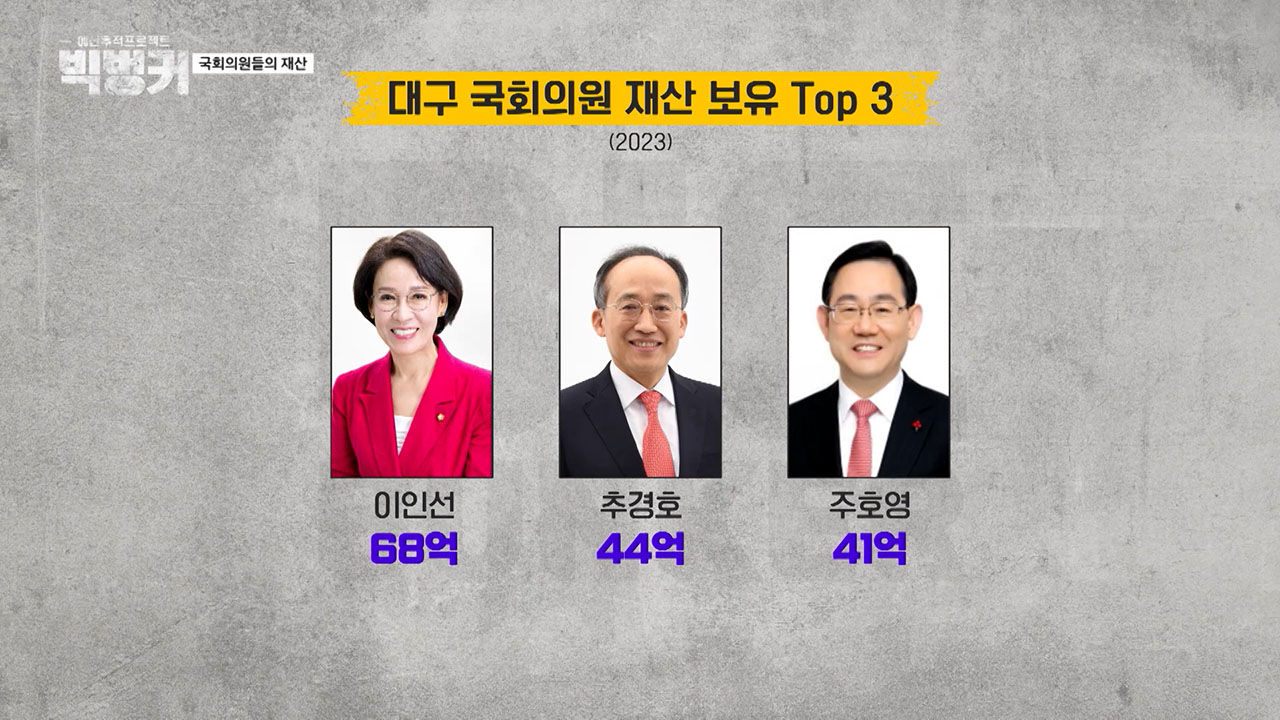 우지영 나라살림연구소 수석연구위원 "물론 국회의원들의 재산이 많은 게 문제는 아닙니다. 하지만 당선 후에 재산이 얼마나 어떻게 증가했냐를 봐야 해요. 그래야 국회의원이 직위를 개인적으로 이용하진 않았는지 조사를 시작할 수 있거든요? 일단 재산 증가액부터 살펴보면 부산에서 재산이 가장 많이 증가한 국회의원은 안병길 의원으로 4년간 증가액이 무려 27억 9,942만 9천 원으로 103% 증가했고요, 재산이 두 번째로 많이 증가한 김도읍 의원의 경우 17억 1,603만 5천 원이 늘어 2020년 대비 47% 증가했습니다. 비상장 주식 평가액 하락과 백지신탁으로 재산이 354억 원이 준 전봉민 의원을 빼고 평균을 계산해 봤더니, 6억 7백만 원 정도가 늘었고요. 대구를 보면 가장 재산이 많이 증가한 의원은 추경호 의원이에요. 증가액이 12억 5,083만 1천 원으로 2020년 대비 39% 증가했습니다. 대구 국회의원 전체 평균은 5억 8천6백만 원이 늘어난 거로 나타났습니다"